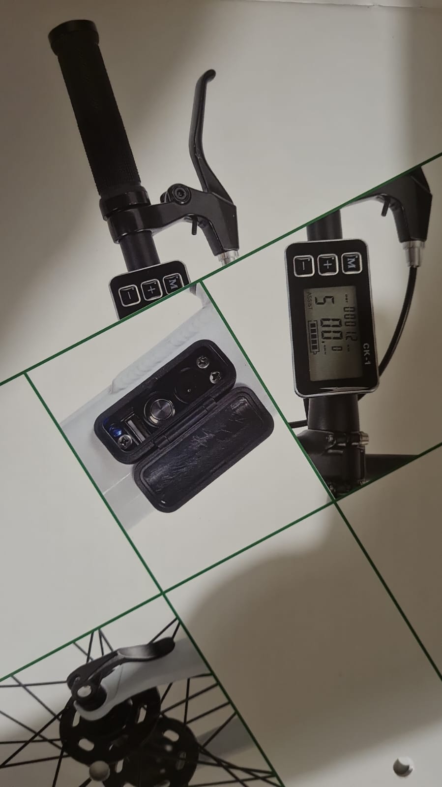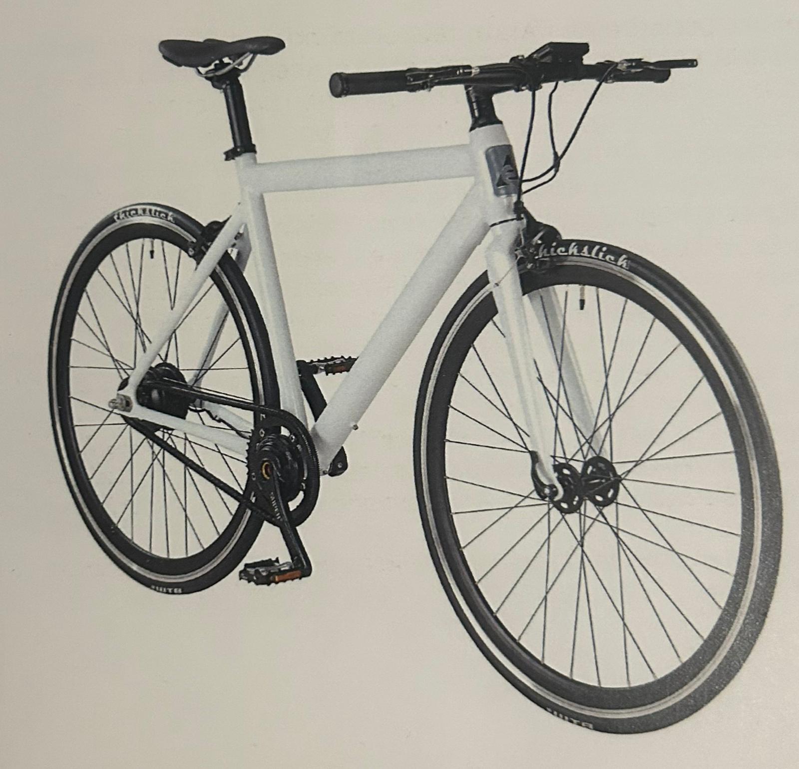 Bici da corsa elettrica con batteria integrata. Le ruote sono nere con una scritta bianca. Display per batteria e piccolo campanello bianco. Parafango posteriore attaccato al sellino.