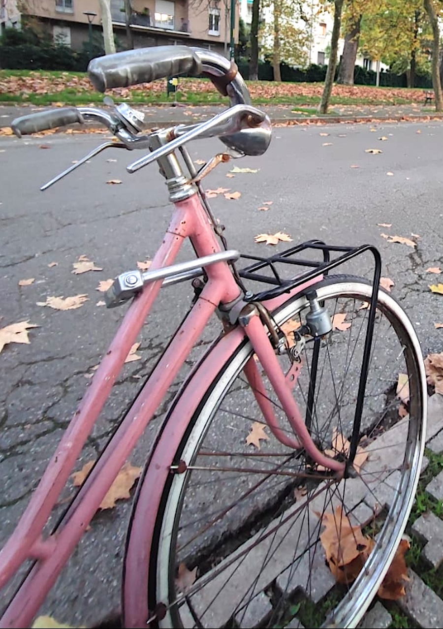 City bike da donna, telaio colore rosa senza scritte, freni a bacchetta, portapacchi anteriore nero, dettaglio del parafango posteriore staccato (lamina in acciaio)