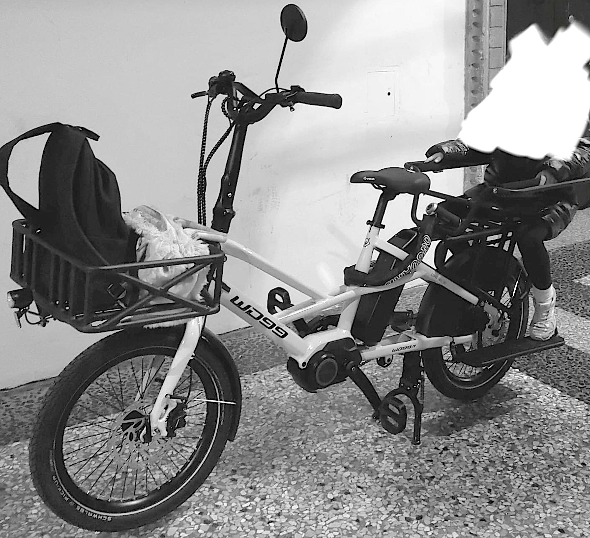 Cargo Longtail 20'' attrezzata con il porta bambini posteriore.