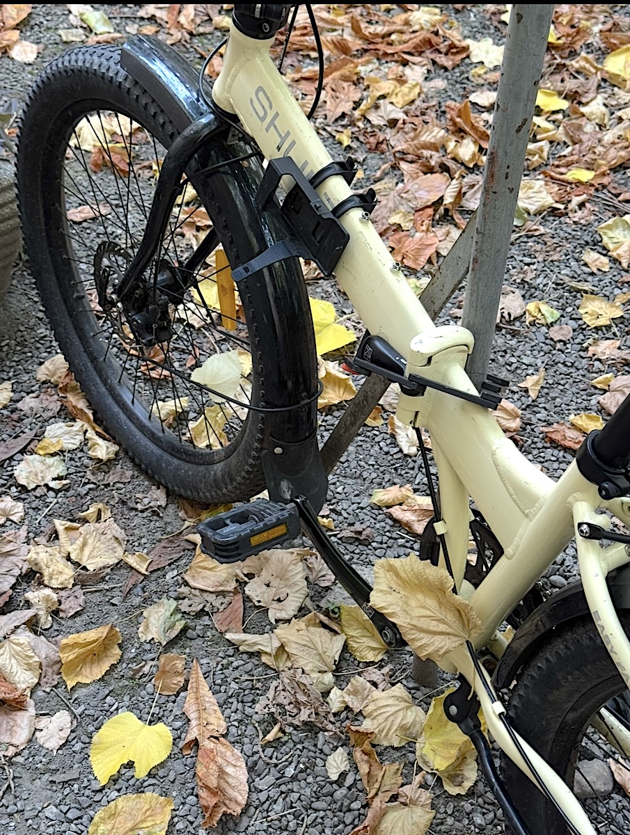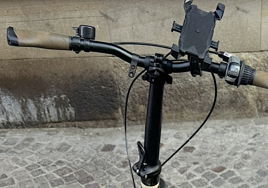 Bici pieghevole Shulz Easy Fat (marca russa), colore panna con dettagli neri e sella marrone in pelle, freni a disco