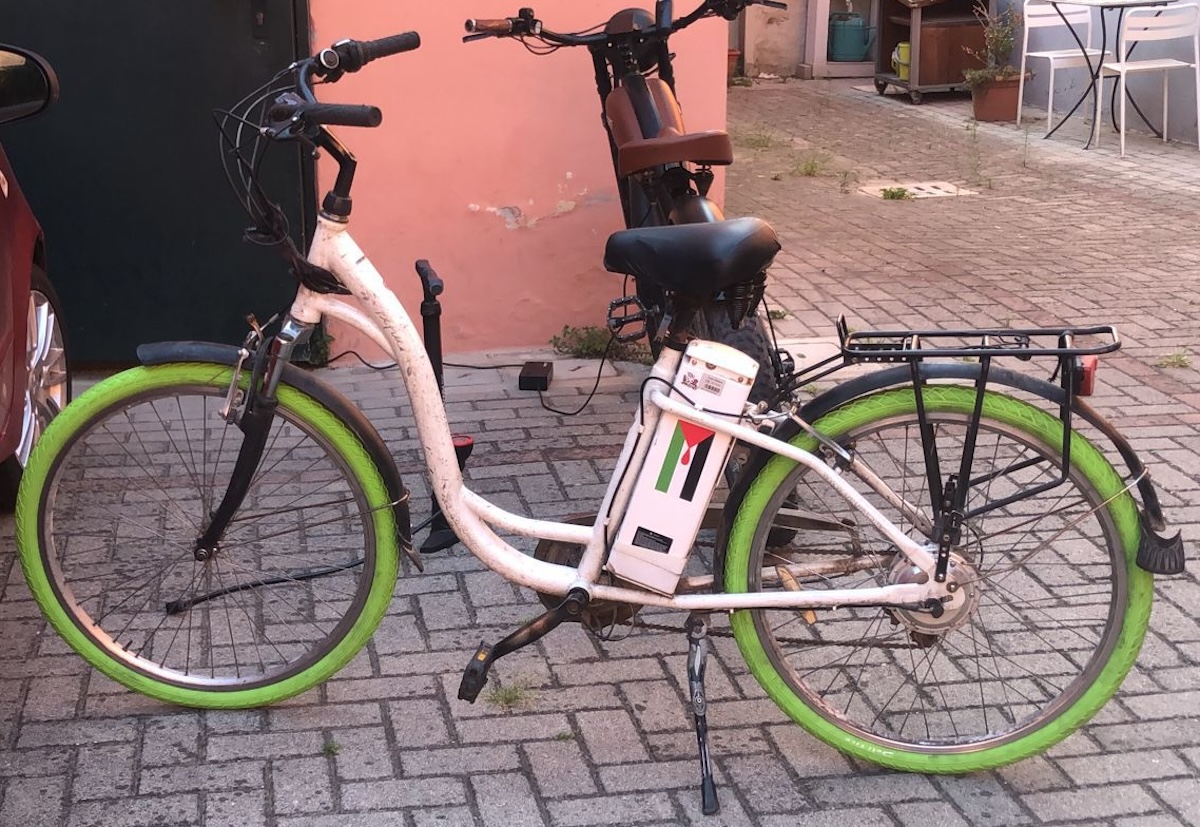 Bici elettrica, telaio bianco con la scritta BeFree in grigio, copertoni verde fluo, adesivo bandiera sulla batteria