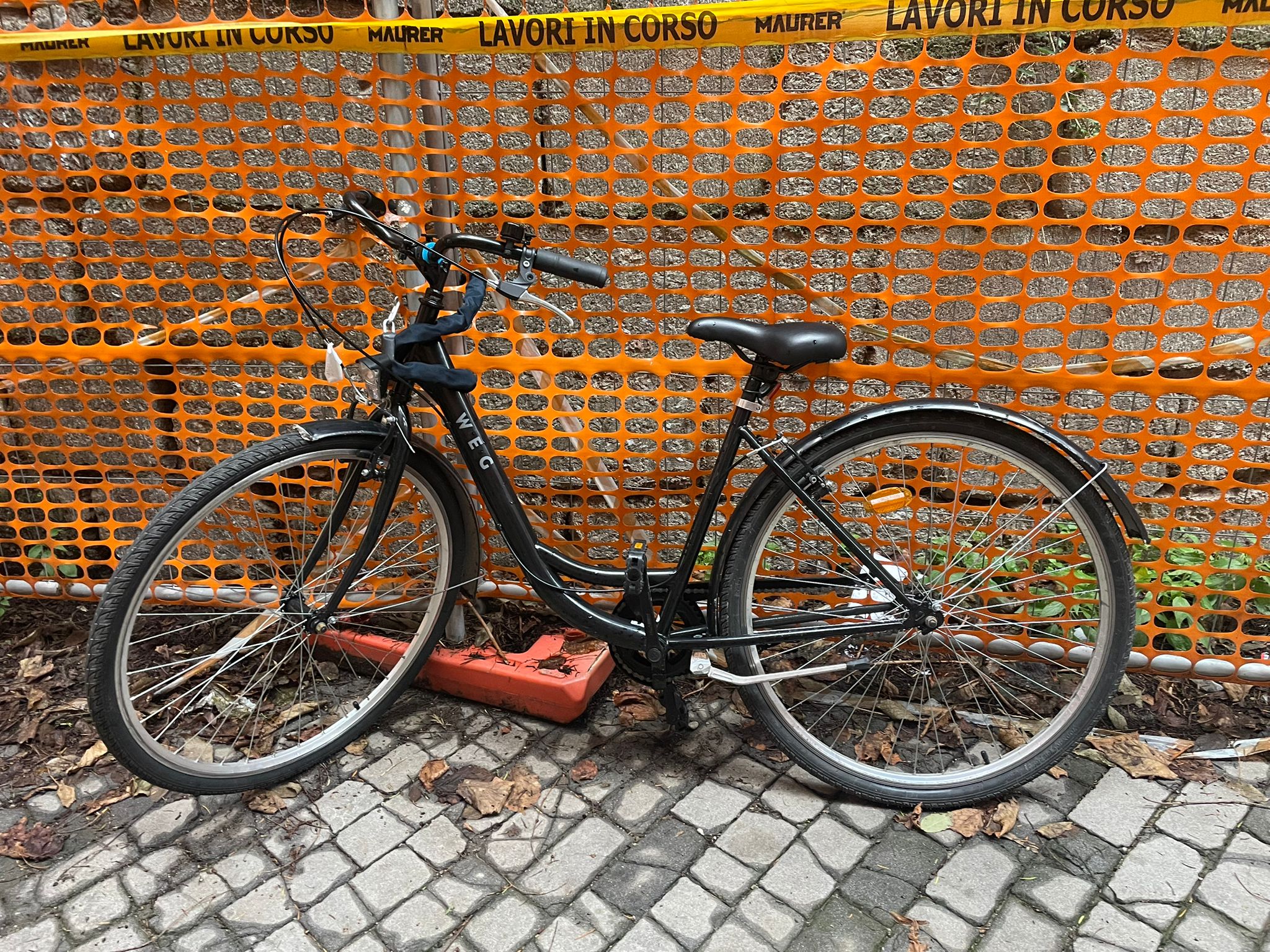 descrizione / segni particolari: Presenta un graffio piuttosto evidente sul telaio, sotto il logo (WEG), visibile in alto a sinistra, ma nel complesso è in condizioni piuttosto buone. Inoltre, i freni sono stati regolati di recente e sulla bici è presente un supporto per il cellulare; sul parafango è ancora presente la pellicola protettiva. Manca la parte in gomma della luce anteriore che serve per accenderla.