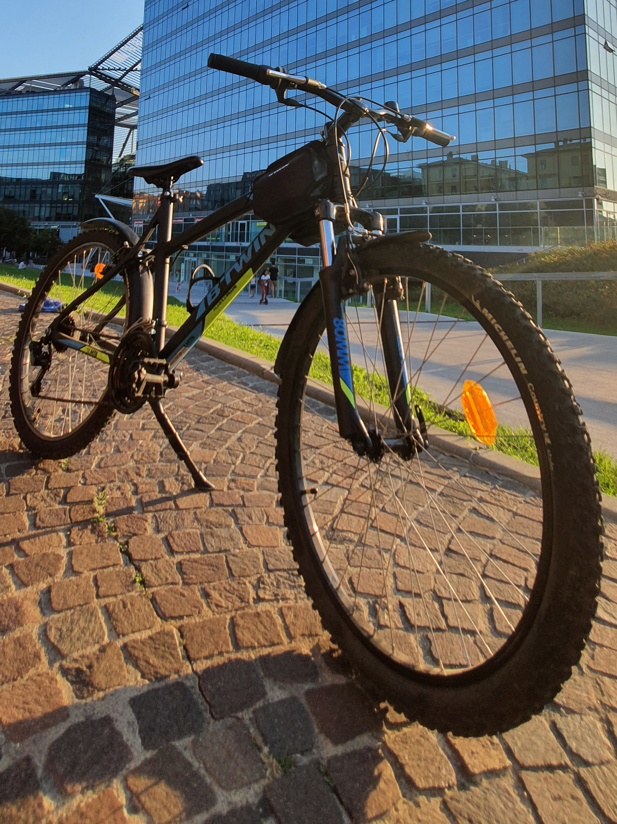 Mountain bike marca B-Twin, modello RockRider colore nero opaca con elementi inserti blu/azzuro e verde fluo più un portaborraccia nero e le ruote sono della Michelin